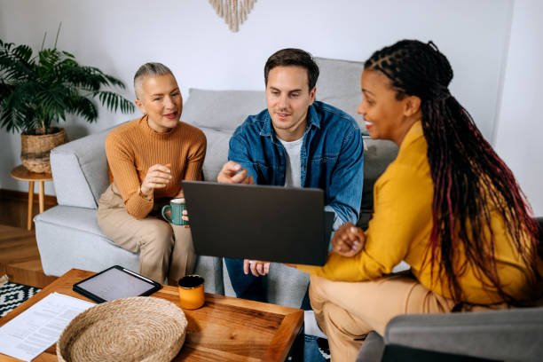 Smiling couple talking with financial advisor at their apartment